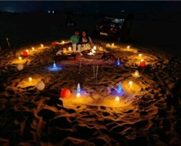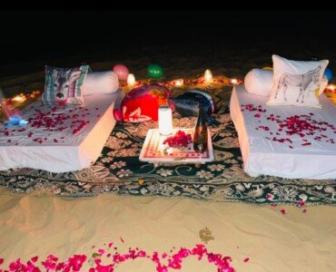 Our team of experts leaves no stone unturned to curate an unforgettable dining setup that exceeds your expectations. Every detail is thoughtfully arranged to ensure a magical and immersive experience. Visualize elegant tables adorned with luxurious linens, gently swaying in the desert breeze, while soft candlelight illuminates the night, creating an ambiance of pure romance and wonder.